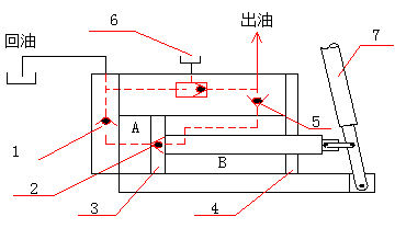 本產品采用內排內泄結構。首先擰緊卸油閥手柄6,拉手柄7,活塞3在泵4腔內后退,油箱中的工作油經單向元件1進入手動泵前腔A,后腔B中的工作油因單向元件2關閉,只能經單向元件5壓入油缸,手柄7前推,單向元件1關閉,前腔A內的工作油經元件2進入后腔B,由于前腔A容積大于后腔B容積,多余的工作油仍經元件5壓入油缸,往-復完成一個循環,手動泵28毫升油進入油缸。擰松泵體側面的手柄6,即可回油卸壓,油缸內的液壓油回油箱,油缸泄油。